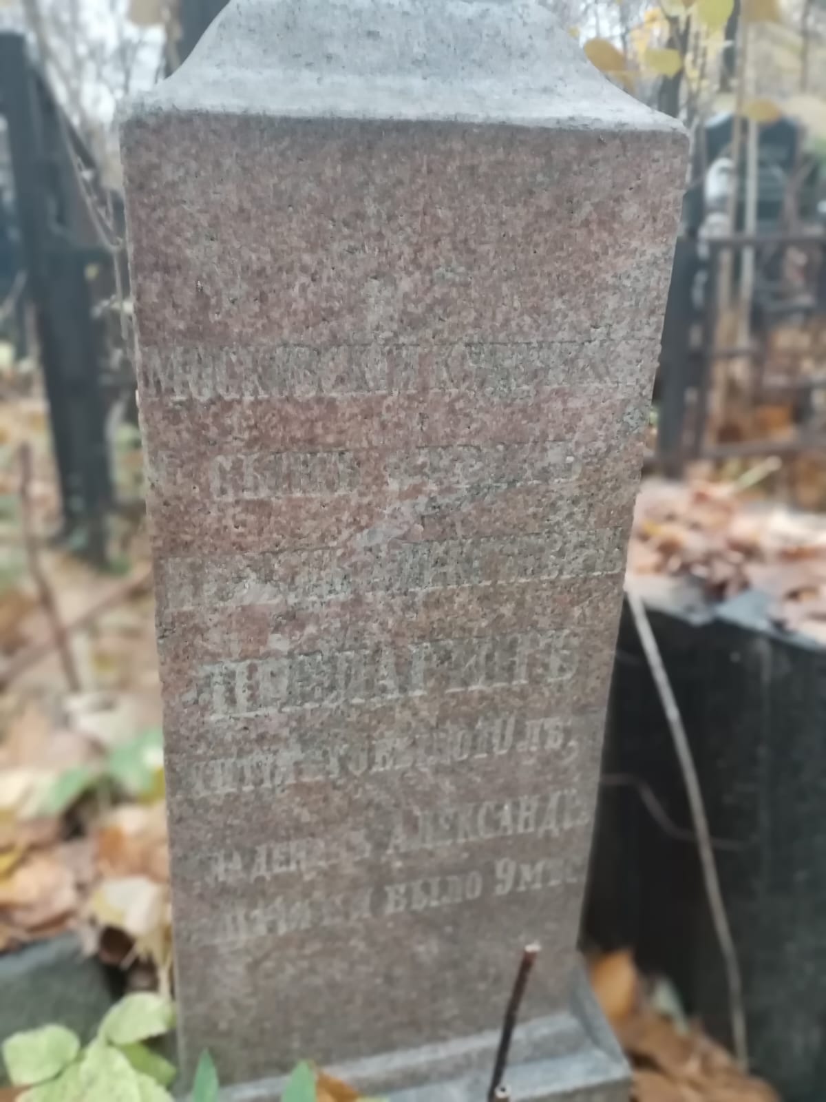 Московский купец Шелагин Алексей Егорович Памятник на месте захоронения Алексея Егоровича Шелагина лежит на боку. Упал видимо недавно. Место.Рядом его жена Александра Федотовна (ур. Рудакова) и первая жена Агриппина Ивановна. А также дети от первой жены: отрок Иван 10 л. и младенец Александр 9 мес. Шелагина-Дуброва Ольга Николаевна 1886-1974 гг. вероятно жена Николая Алексеевича р.1872, т.к. на дочь плохо подходит по возрасту. И две могилы Огородниковой, Андреевых и Молчевской, возможно имеющих отношение к Шелагиным. Видео. 27.10.2025 | ![]() |