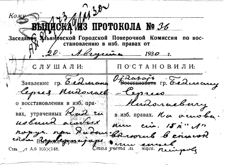 Сергей Николаевич по "делу Лицеистов" получил статус "лишенца" за прежнюю