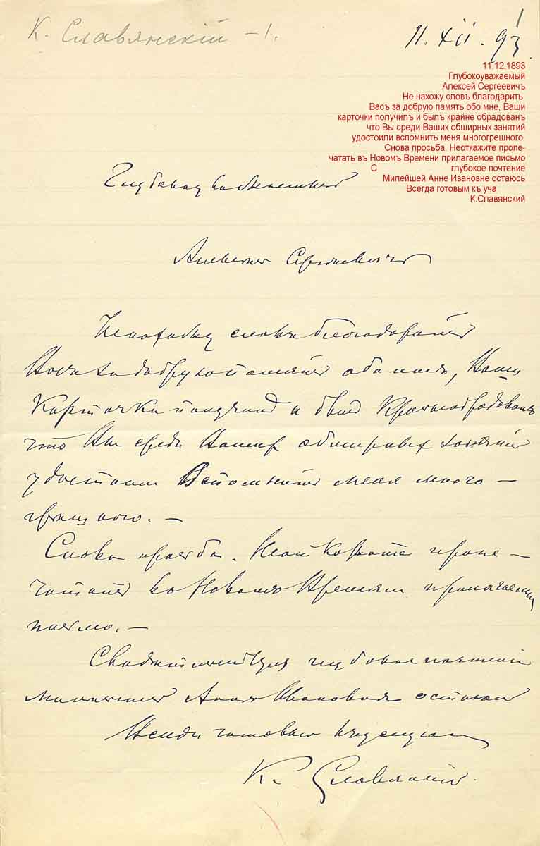 РГАЛИ, ф.459, оп.1, ед.3946 Письмо 11.12.1893 г. К.Ф.Славянского издателю А.С.Суворину.