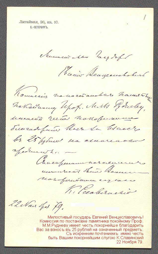 РГАЛИ, ф.275, оп.1, ед.646 Письмо 22.11.1879 г. К.Ф.Славянского проф. МХА Е.В.Пеликану - Благодарность за участие в установке памятника проф. М.М.Рудневу.